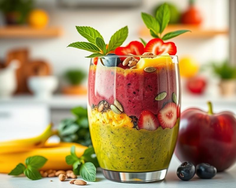 - Koktajl z jarmużem: jarmuż, banan, jabłko, woda – bogaty w witaminy i błonnik, doskonały na śniadanie.